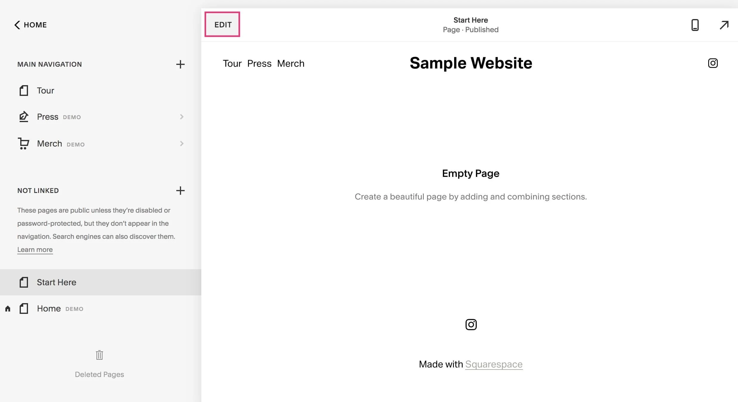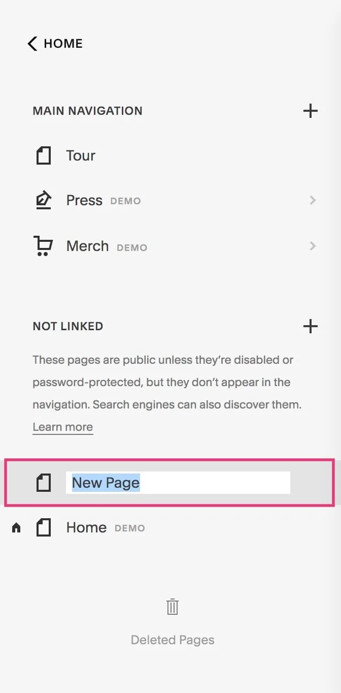 Squarespace will automatically default to naming the page “new page.” You can change this to something simple like “Instagram” or “Info.”