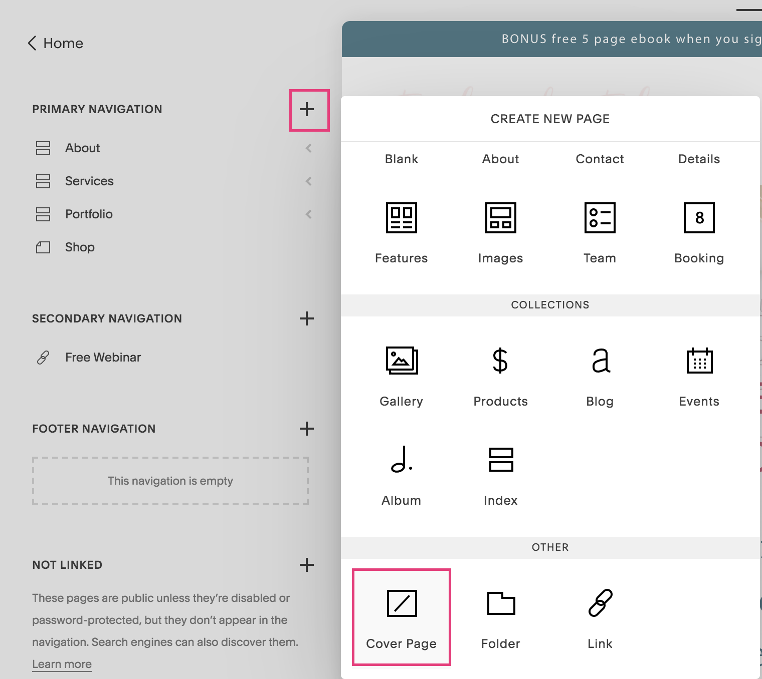 Under Pages, you can click the + symbol next to the Primary Navigation and then choose “Cover Page.”