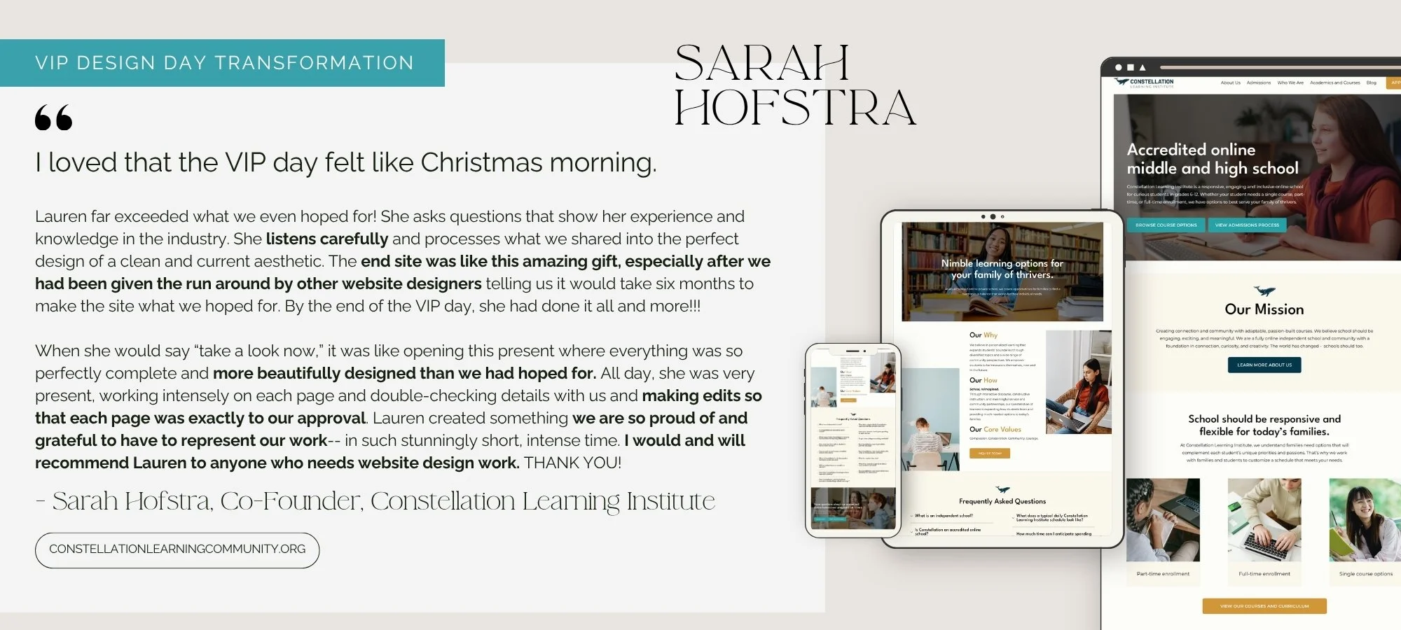 A business consultant client loved the VIP day format specifically because she hates dragging out decisions. "Tell me my options, let me choose, move forward - that's how I operate in business and it's how I wanted my website project to work." The real-time format matched her decision-making style perfectly.
