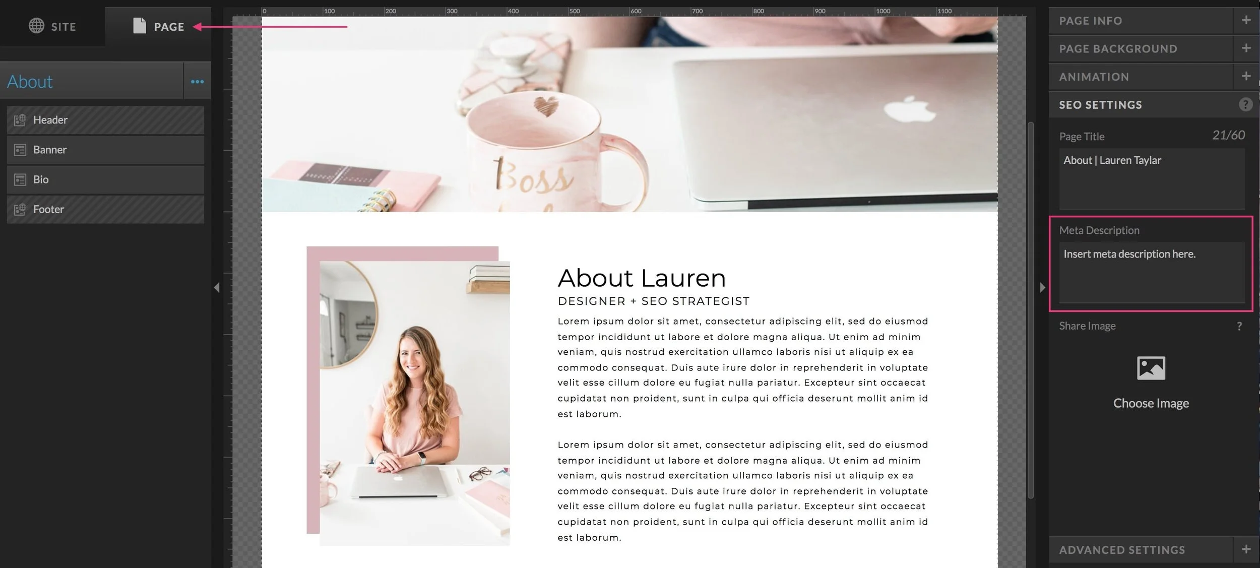 Ensuring that each page has its own relevant title tag with your SEO strategist is extremely important, and Showit makes adding them super easy.