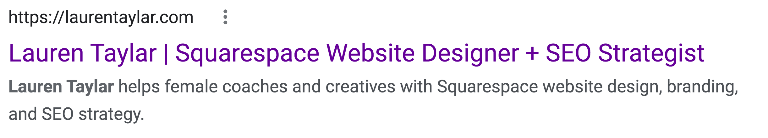 Here, my meta description is “Lauren Taylar helps female coaches and creatives with Squarespace website design, branding, and SEO strategy.”