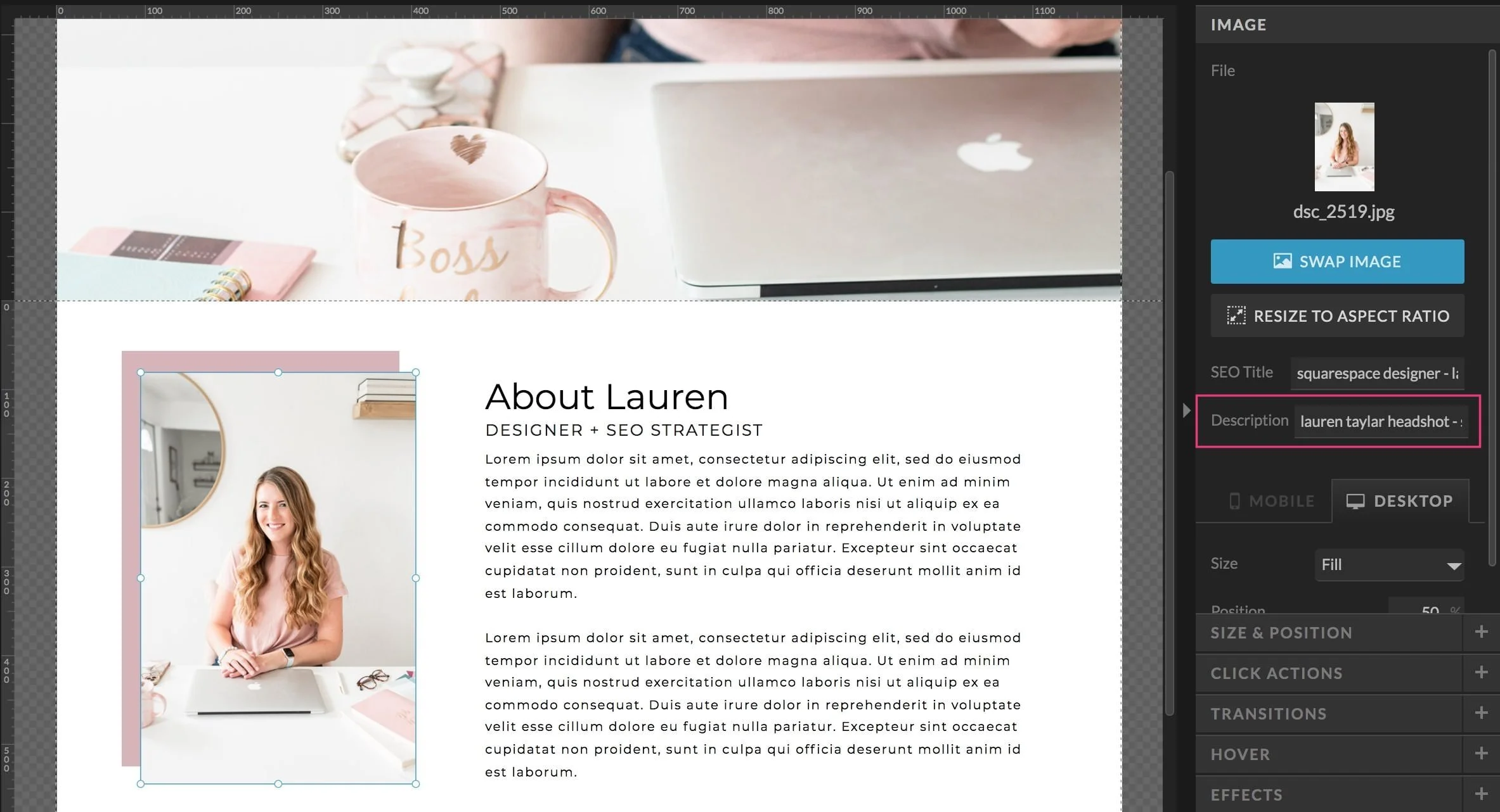 Directions: Inside Showit, select an image on your screen and click on the image tab on the right. There, you’ll see the option to edit the SEO Title.